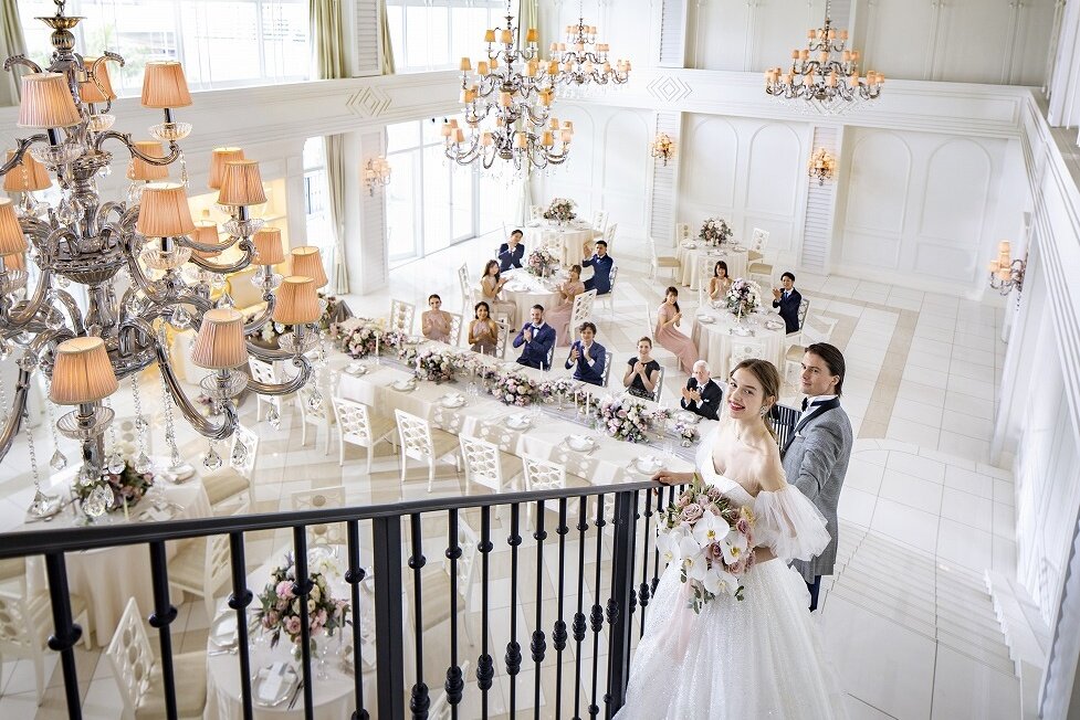 #阪急限定ウェディングプラン #リゾート感 #自然・緑に囲まれた #自然光の入る会場 #ガラス張り #フロア貸切 #プライベートテラス #スタイリッシュ #100名以上の披露宴 #滝 #大階段