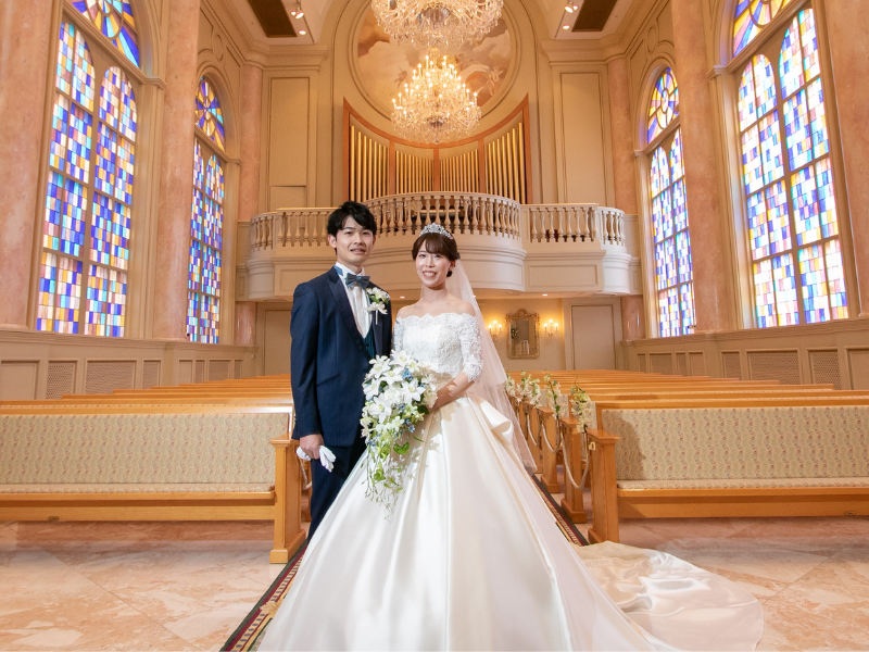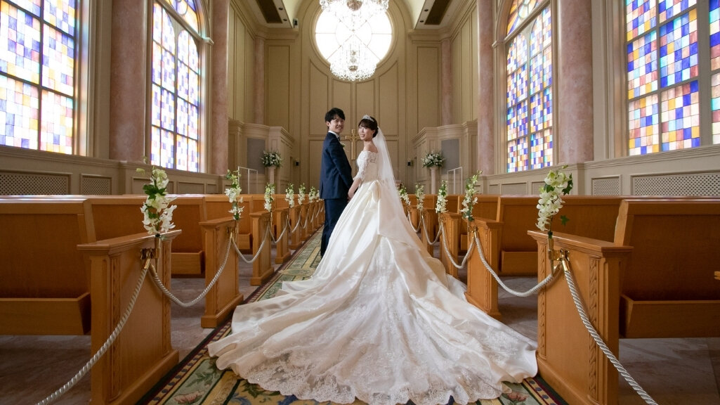 高い天井に煌びやかなシャンデリア、長いバージンロードはヨーロッパの大聖堂の面持ち。