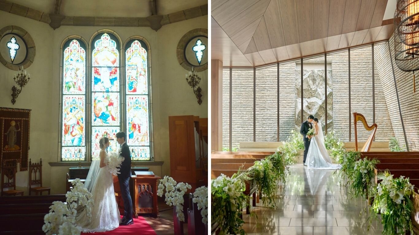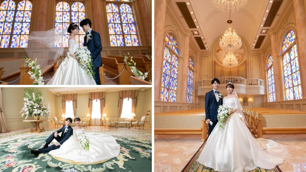 本物のチャペル、挙式用のウェディングドレス、タキシードを着てのチャペルフォト。