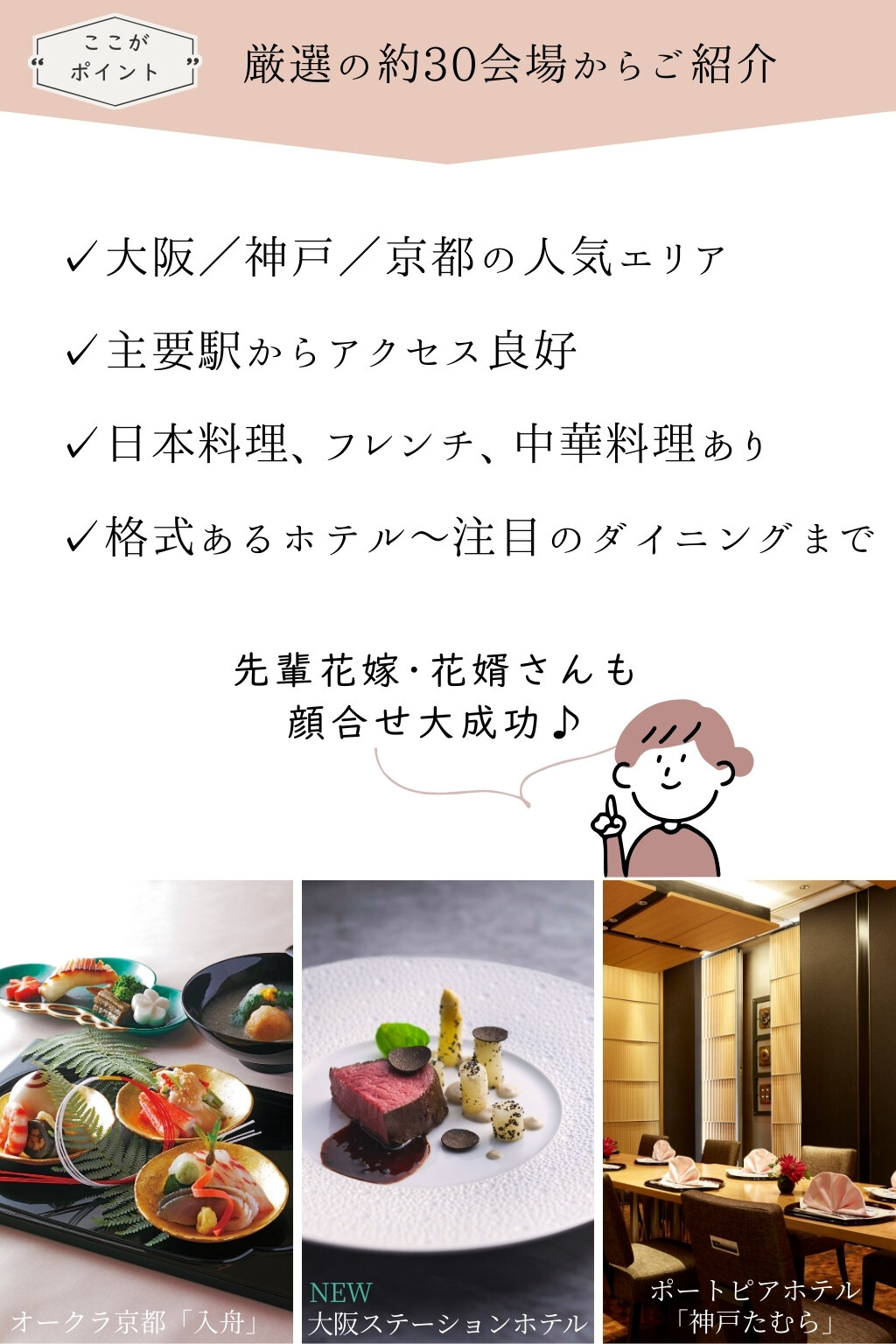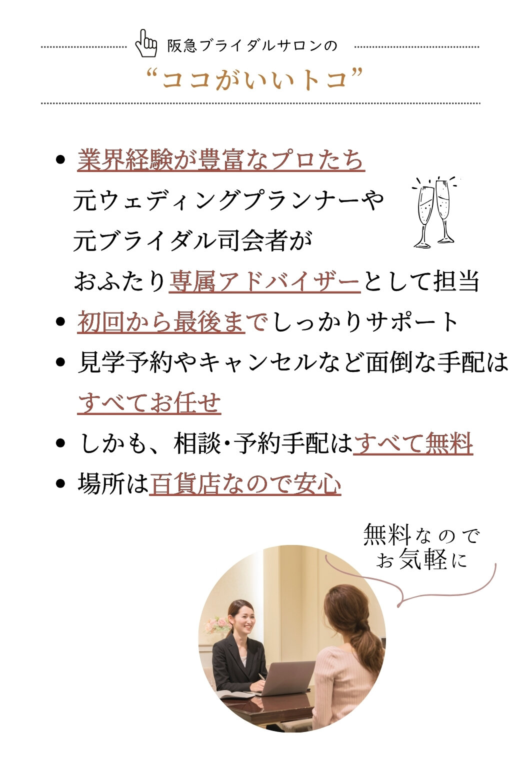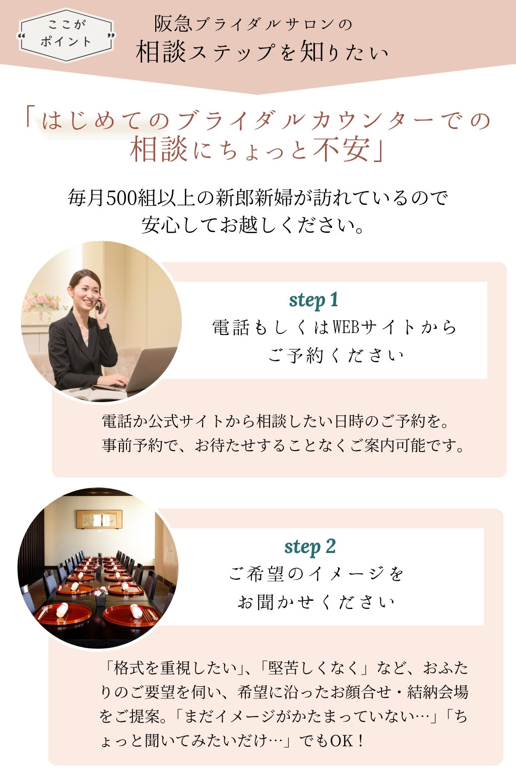 結婚式をする・しないに関わらず、結婚が決まったら両家同士の挨拶の場は必要。阪急ブライダルサロンでは、おふたりに専属のアドバイザーがつき、マンツーマンの対面で「結納という形式を大事にしたい」、「形式よりも両家の交流が目的」といった、おふたりのお考えをお伺いし最適な会場をご提案いたします。