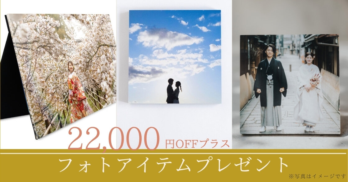 期間中のお申込み、撮影で通常プラン価格より22,000円OFF!さらに、各プランにフォトアイテムのプレゼントがついて