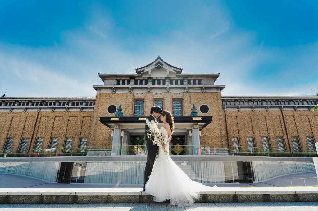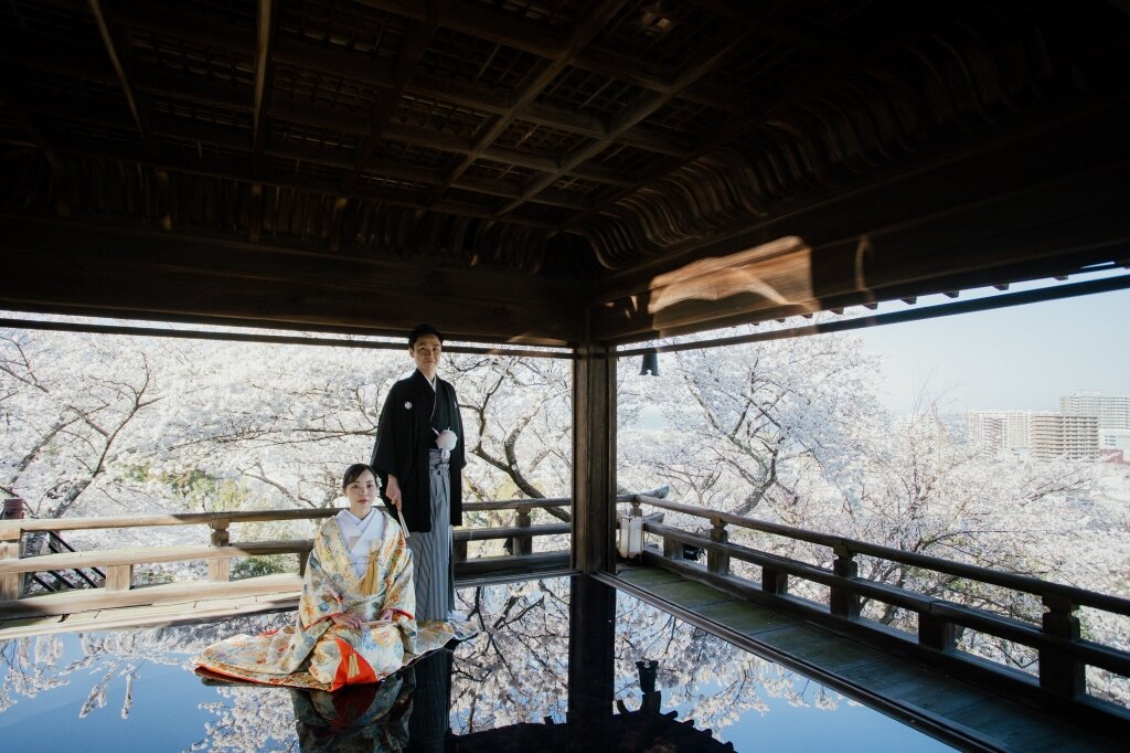 桜の開花時期だけに用意される観月舞台での撮影は、完全予約制。舞台にアクリル板を敷き、鏡のように桜が映る「逆さ桜」の光景が撮影できることが特長。歴史的建造物と桜のコントラストと、大津の街並みや琵琶湖を一望できることもおすすめのポイント。圧巻の桜と和装姿のおふたりがよく映えます。
