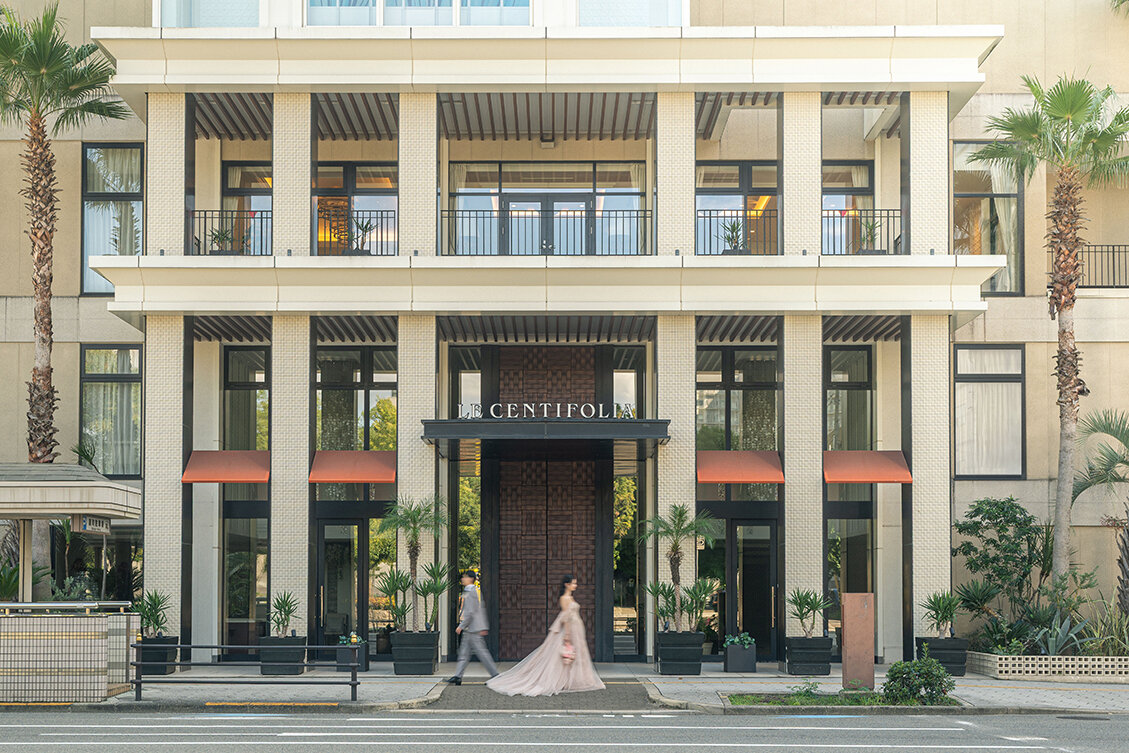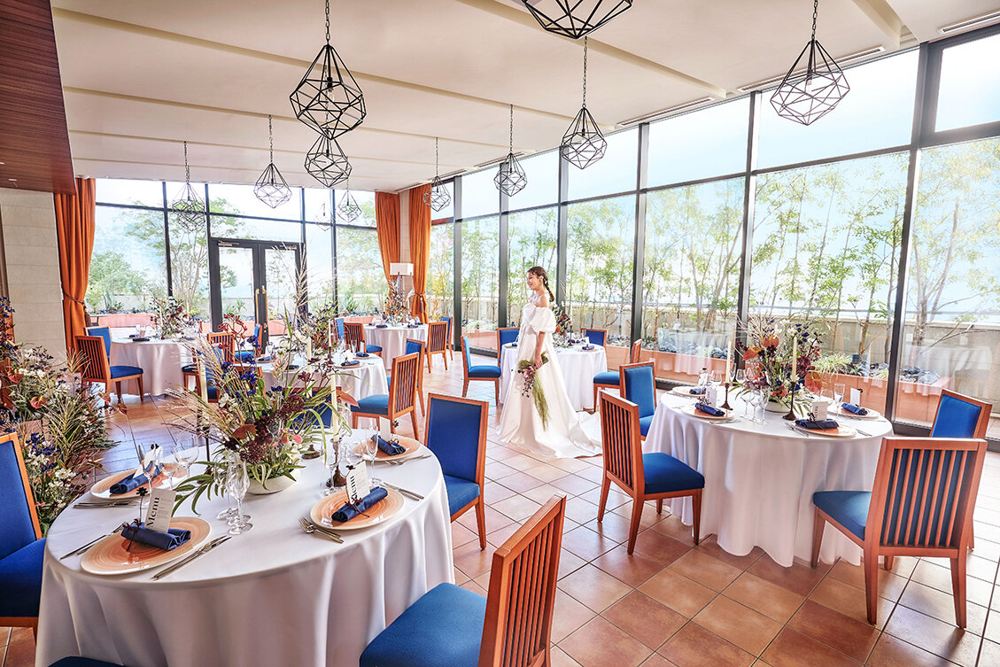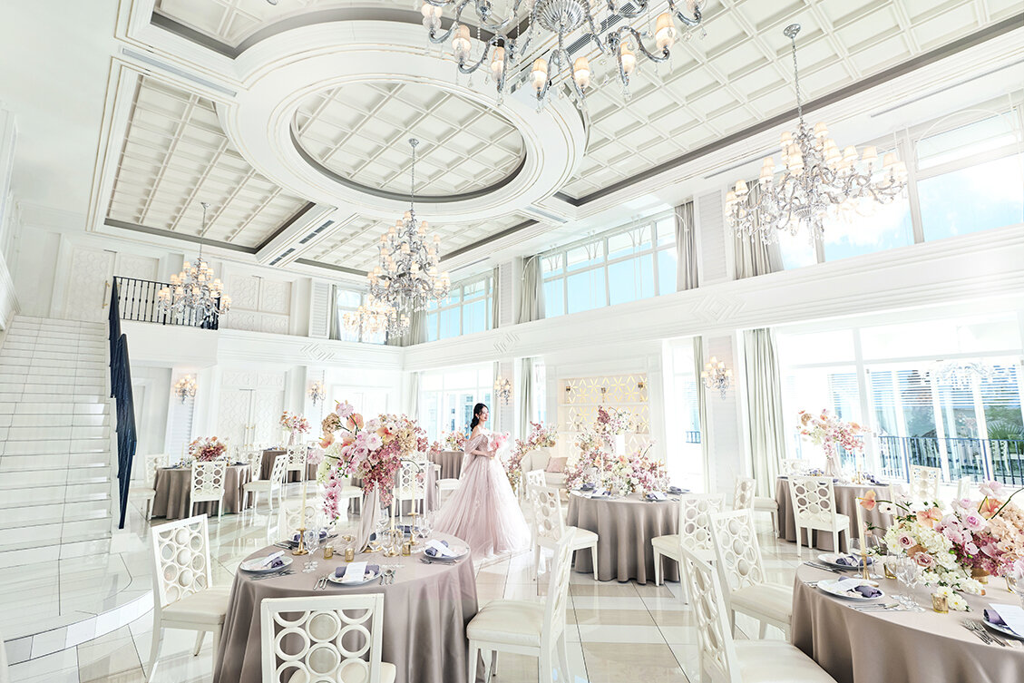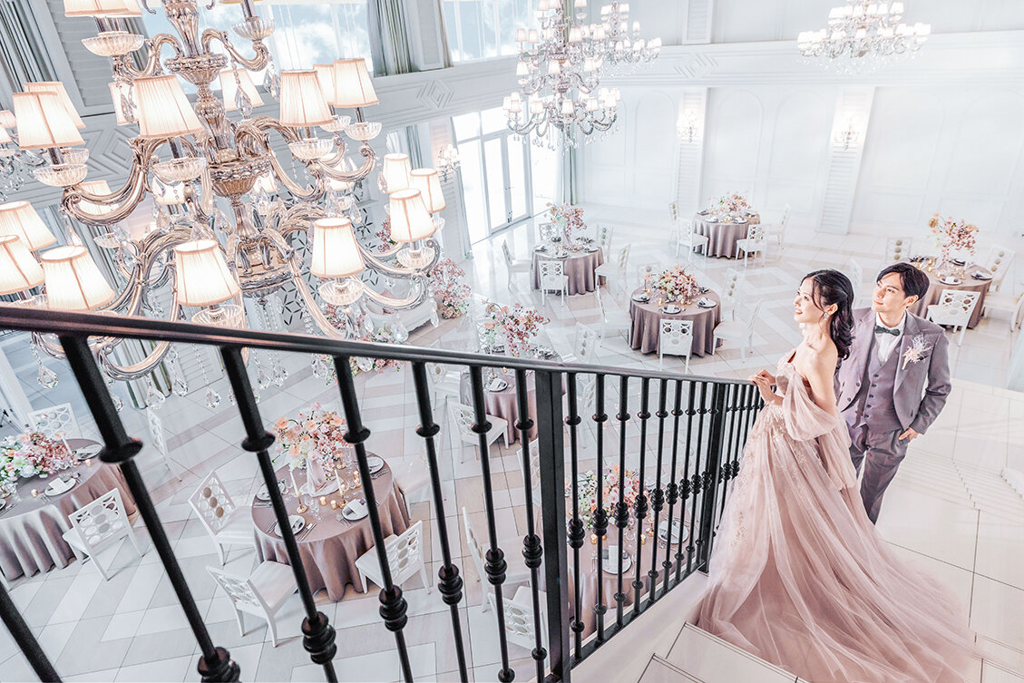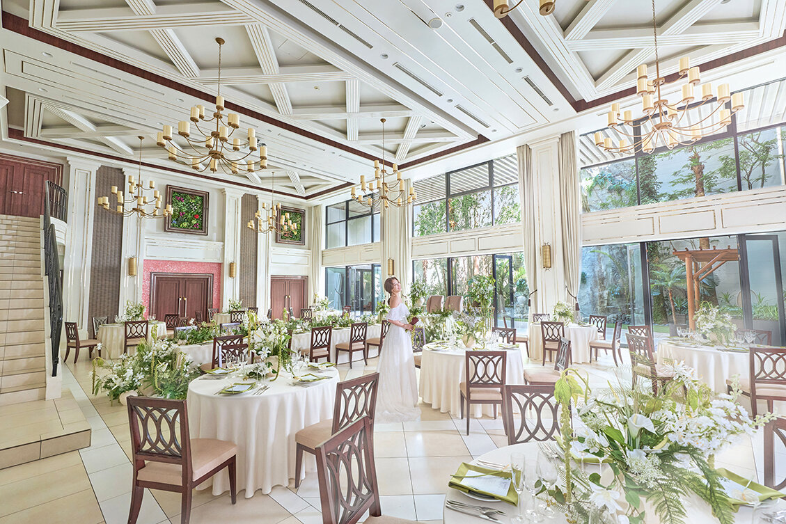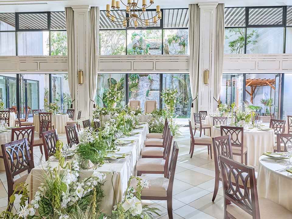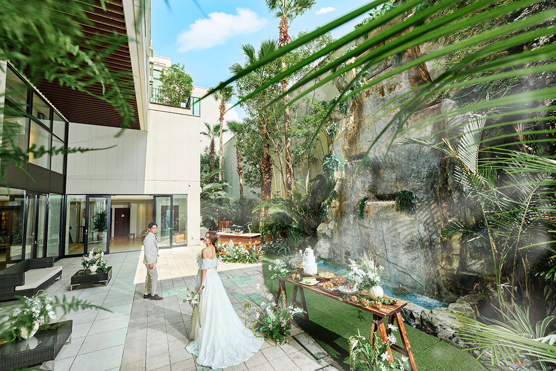 #阪急限定ウェディングプラン #リゾート感 #自然・緑に囲まれた #自然光の入る会場 #ガラス張り #フロア貸切 #プライベートテラス #スタイリッシュ #100名以上の披露宴 #滝 #大階段