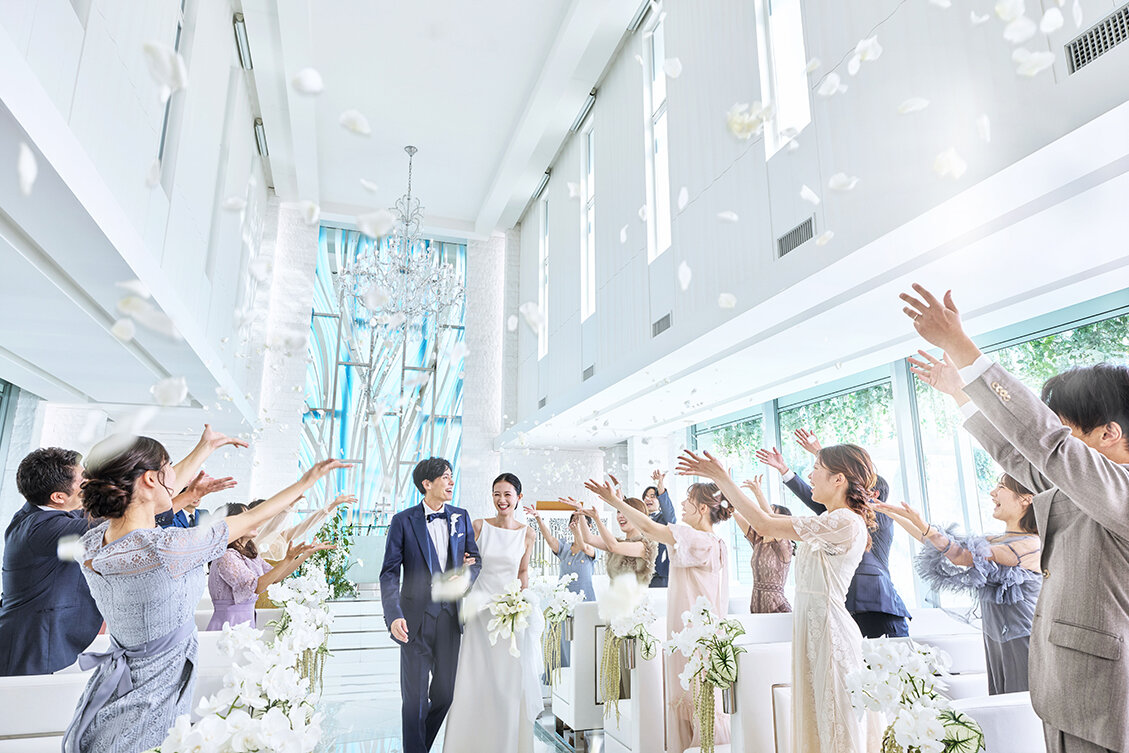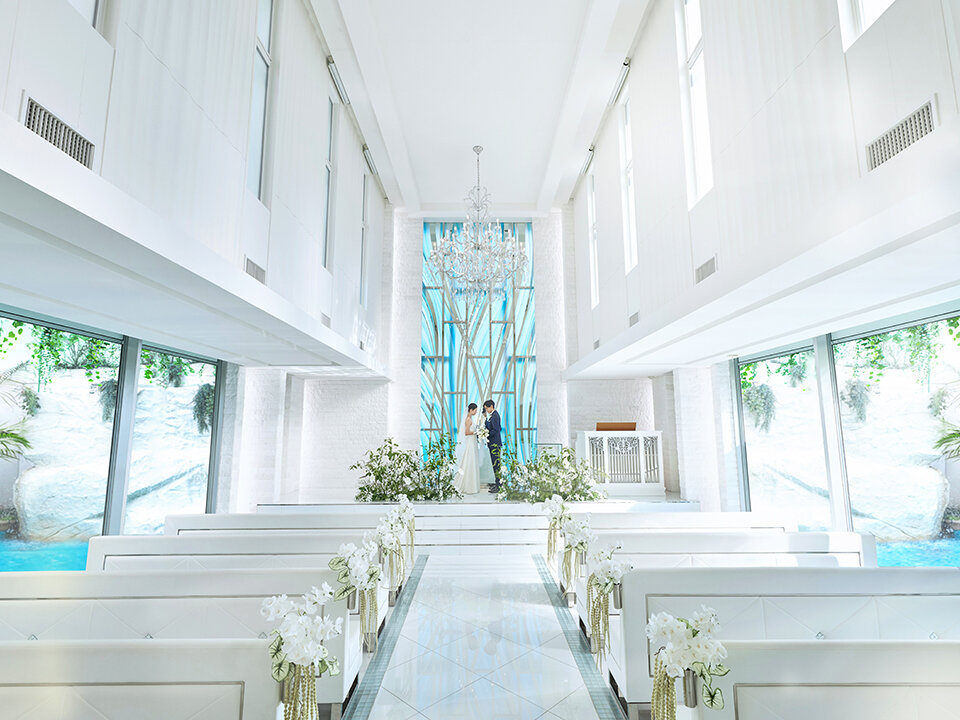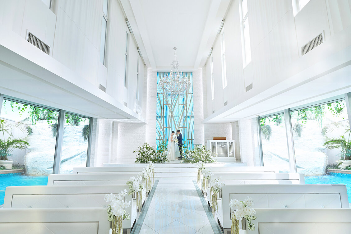 水庭を陽射しが照らし2面の窓からは自然光がさんさんと注ぐ清らかな空間。祭壇は4段高くに設けられ後方からも誓いの瞬間を見守れる。