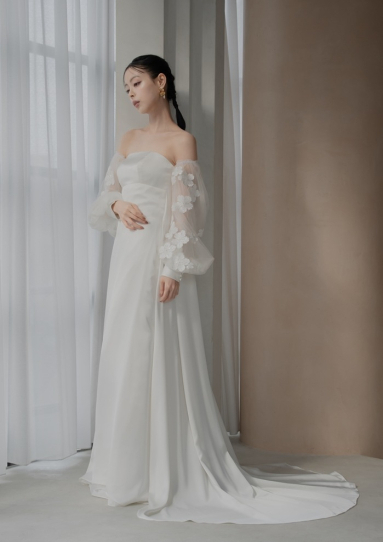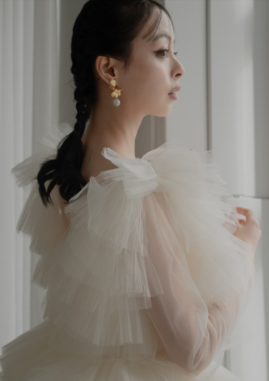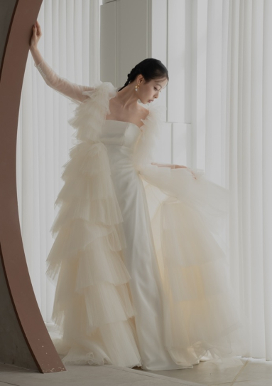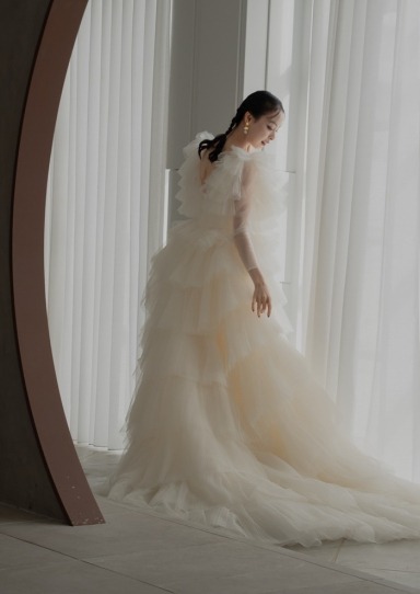 | 詳細 | ガウンスタイルの総プリーツチュールのティアードドレス。 ガウンは前を閉じればAラインのドレスですが、前を開いて着ていただくこともでき、シックな印象にも。 シンプルなサテンのドレスとして、別途オプションのスリーブを付ければアレンジも楽しめます。 |